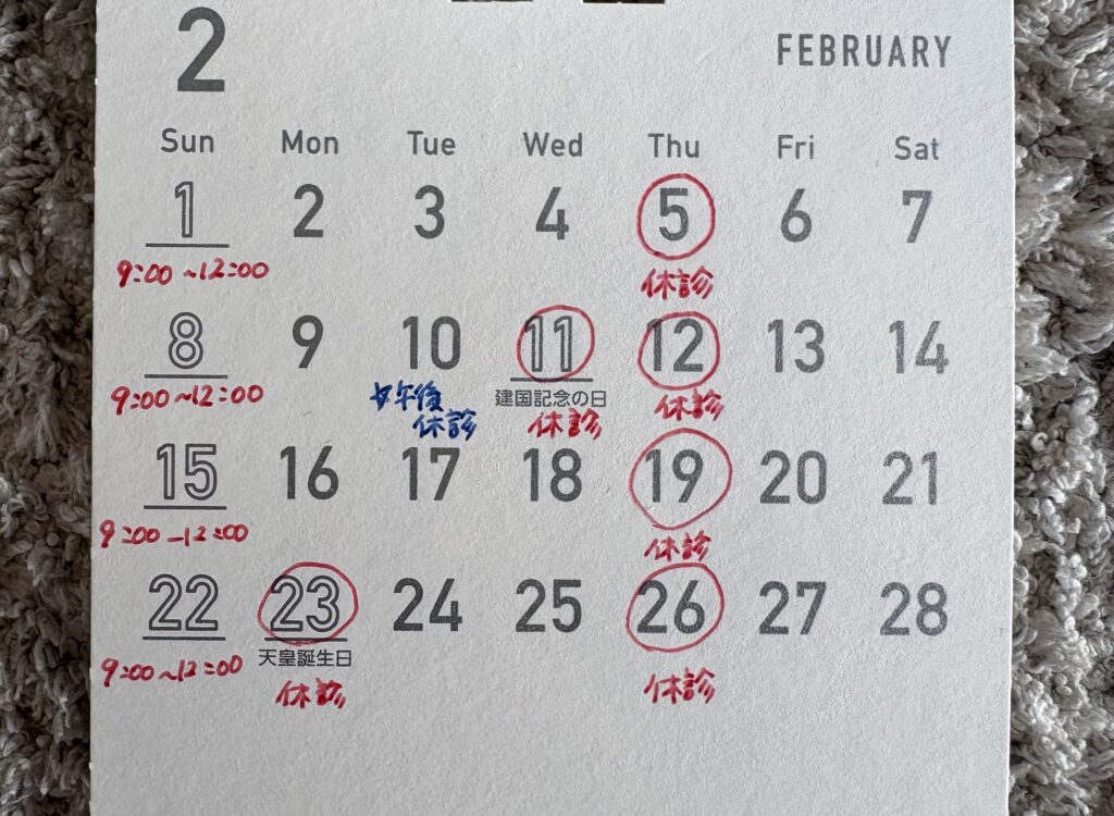 2026.2.10 診察スケジュール 2月の診療 今年もわんわんドックにたくさんのご予約を頂きありがとうございました。今月でわんわんドックの予約は終了とさせて頂きます。ドックを希望されている方は今月中にご予約をお願いいたします。 Prev Back to List Next